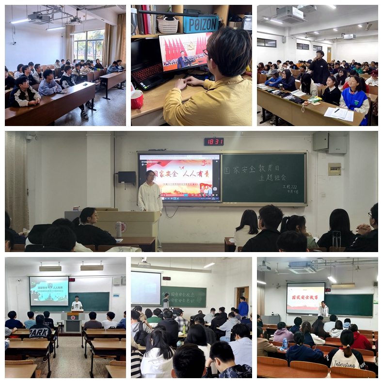 各班级聚焦活动主题,创新活动样式,丰富活动内容。班主任老师组织集体观看以“国家安全”为主题的宣传片,了解“国家安全教育日”的来历及背景,学习总体国家安全观;组织学习习近平总书记有关国家安全的重要论述、《国家安全法》《反间谍法》等相关内容,了解国家安全的内涵;观看《警惕邪教对大学校园的侵袭》视频,结合趣味问答的形式,开展“反邪教警示教育进校园”活动。活动中,土木222班主任蒋宏伟老师分享身边真实案例,生动形象的教育学生国家安全与每个公民息息相关,维护国家安全,是每一个公民及组织应当履行的义务和权利,引起学生共鸣,有效帮助学生树立国家安全,匹夫有责意识。