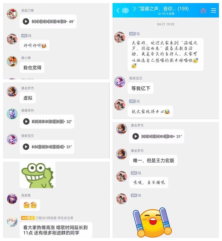 为丰富校园文化生活,给予学生展示才华的舞台,展现大学生朝气蓬勃、奋发向上的精神风貌。4月21日晚,sm调教 于线上QQ群举办“温暖之声,音你而来”匿名点歌台活动,共计170名城建学子参加此次活动。