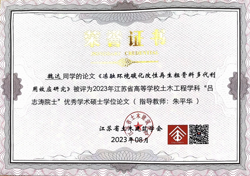 近日,从江苏省土木建筑学会传来喜讯,sm调教 2023届本科毕业生土木工程专业俞文祺、蔡苑泓获评“2023年度江苏省土木工程专业优秀毕业生(本科)”,工程管理专业陈一诺获评“2023届江苏省大学生工程管理专业优秀毕业生”,硕士毕业生史志浩获评“2023年度江苏省土木工程专业优秀毕业生(硕士)”。硕士毕业生魏达的毕业论文《冻融环境碳化改性再生粗骨料多代利用效应研究》(指导教师:朱平华)被评为“2023年江苏省高等学校土木工程学科‘吕志涛院士’优秀学术硕士学位论文”。