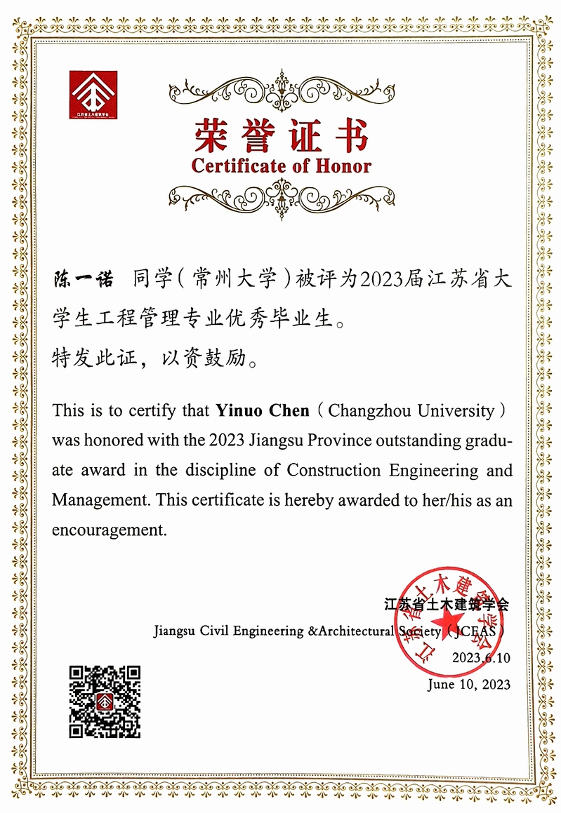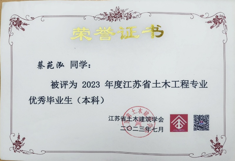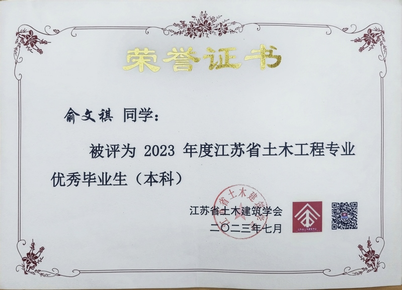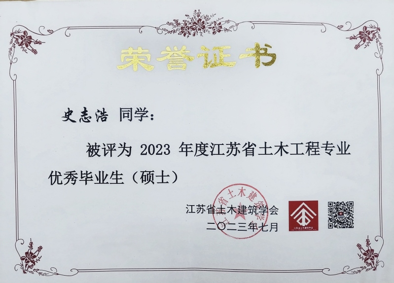 近日,从江苏省土木建筑学会传来喜讯,sm调教 2023届本科毕业生土木工程专业俞文祺、蔡苑泓获评“2023年度江苏省土木工程专业优秀毕业生(本科)”,工程管理专业陈一诺获评“2023届江苏省大学生工程管理专业优秀毕业生”,硕士毕业生史志浩获评“2023年度江苏省土木工程专业优秀毕业生(硕士)”。硕士毕业生魏达的毕业论文《冻融环境碳化改性再生粗骨料多代利用效应研究》(指导教师:朱平华)被评为“2023年江苏省高等学校土木工程学科‘吕志涛院士’优秀学术硕士学位论文”。