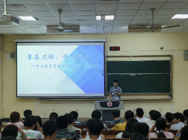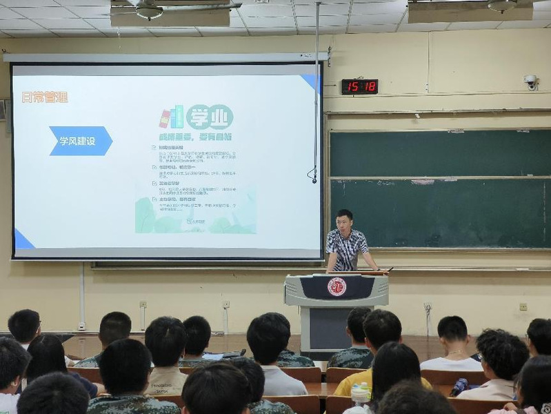 黄龙首先强调了遵守校规校纪的重要性,他指出遵守校规校纪是维护学校正常教学、科研、管理和生活秩序的重要保障,是学生保障合法权益的重要依据。随后,黄龙讲解了《学生手册》相关内容,带领同学们重点学习了学生日常管理、行为规范、违纪处分及处理等相关规定,并结合典型案例,生动而详细地解读了有关校纪校规。最后,黄龙叮嘱新生要继续保持军训阶段养成的优良作风,认真学习专业知识,热爱集体,团结互助,以守正笃实的良好心态顺利开启大学生活的新篇章。