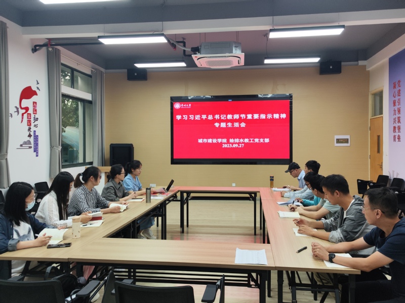 2023年9月27日,给水教工党支部在明行楼119会议室召开学习贯彻习近平新时代中国特色社会主义思想主题教育专题组织生活,会议由支部副书记仲慧赟主持。