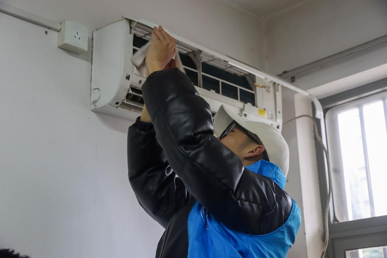 志愿团成员们分成2队,进入楼栋进行清理活动。成员们分工合作,首先对空调外侧进行彻底擦洗随后取下满是污垢空调滤网,多次用清洁剂清洗干净,确认无误后装回确保空调可以安全运行。团队成员们相互支持,创造了一个清洁舒适的住宿楼,让暖意通过空调传递给每一个人。