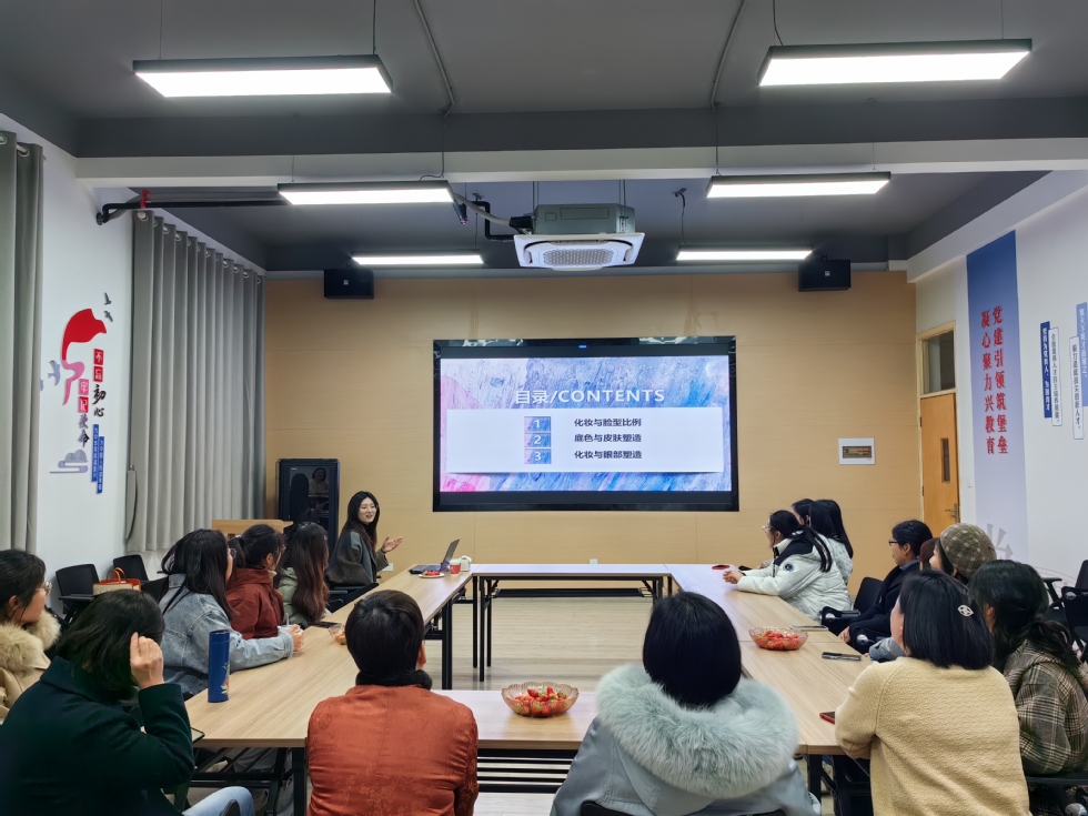 讲座邀请了音乐与影视学院彭子凌老师进行授课。彭老师首先向大家介绍了化妆的基本知识和技巧,包括如何选择适合自己的化妆品、如何打造自然妆容等。接着,她通过现场示范,详细讲解了职场妆容的打造过程,包括底妆、眼妆等方面的技巧。最后,她还邀请了几位女教师上台,亲自指导她们如何根据自己的脸型、肤质等特点打造合适的妆容,让参与者亲身体验化妆的乐趣,掌握实用的化妆技巧。大家一边观摩学习一边提出疑问,她也一一做出专业详尽的答复。
