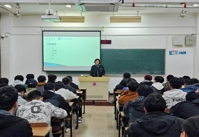 许敏首先向学生介绍四级辅导班成立的原因,强调英语四级在大学学习中的重要地位以及学校相关政策的变化。其次,许敏通过介绍四级题型,从四级的听力、阅读理解、完形填空等题型介绍复习方法,给出复习建议,提升学生学习信心。最后,许敏具体讲解帮扶计划及实行方法,鼓励到场学生掌握科学的备考方法,脚踏实地备考,持之以恒参与辅导班,争取早日通过大学英语四级。