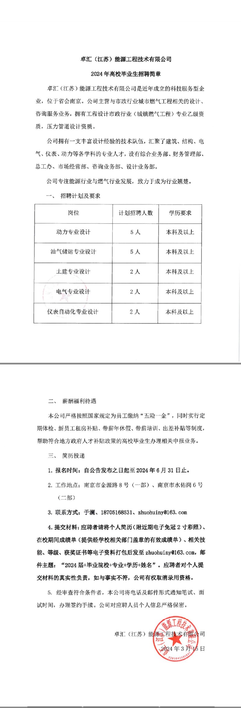 招聘[2024088]卓汇(江苏)能源工程技术有限公司2024校园招聘简章
