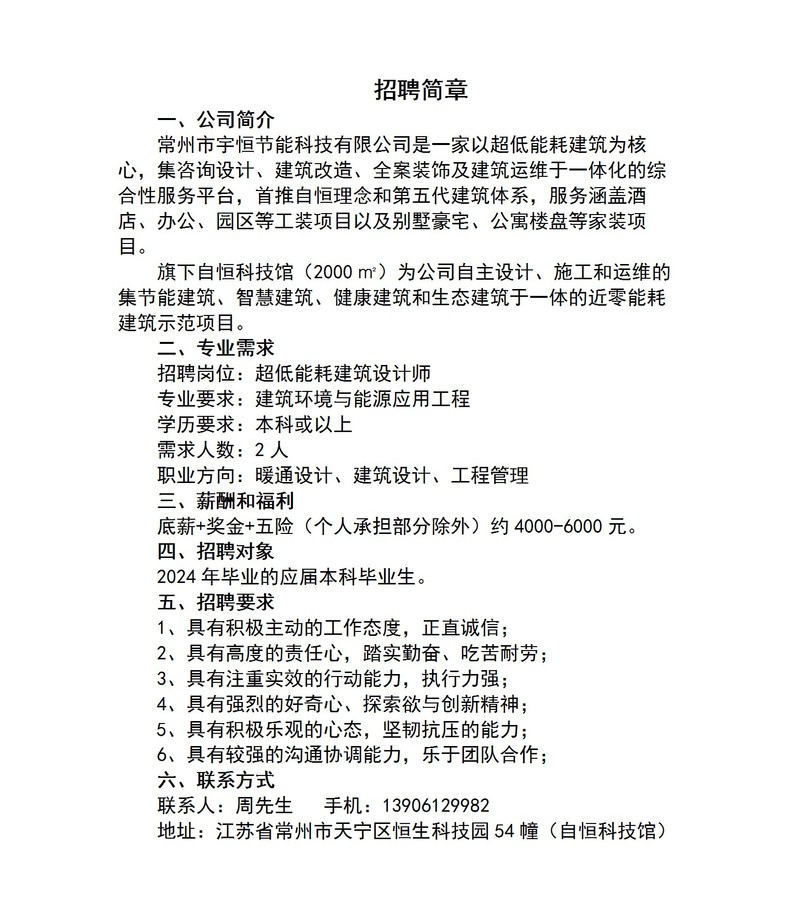 招聘[2024176]常州市宇恒节能科技有限公司2025届校招