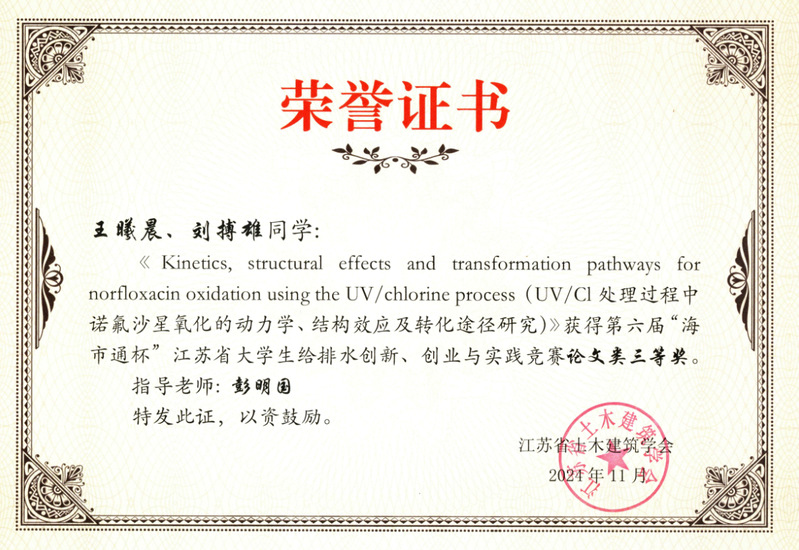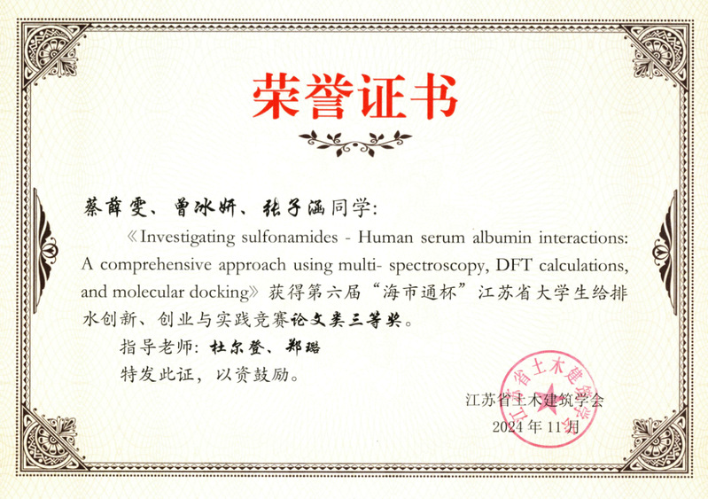 在本次竞赛中,给排水专业有4个项目获奖,其中2项作品获二等奖、2项作品获三等奖。马瑞、李佳瑶、刘建亮、靳墀、王生存同学参赛的作品《水质安全守护者:一种消毒副产物的在线监测与综合安全评价智能平台》,吴瑶、陈雨捷、常亚敏同学参赛的作品《Binding Affinity and Mechanism of Six PFAS with Human Serum Albumin:Insights from Multi-Spectroscopy,DFT and Molecular Dynamics Approaches》分获创意类、论文类二等奖。