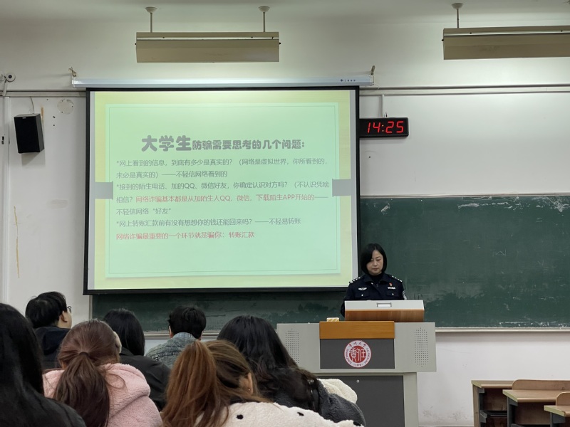 为切实做好学生安全防范教育,进一步提升学生防范电信网络诈骗的意识和能力,筑牢校园网络安全防线,3月14日下午,学院联合科教城派出所,在W1210举办了“防范电信诈骗”主题讲座。