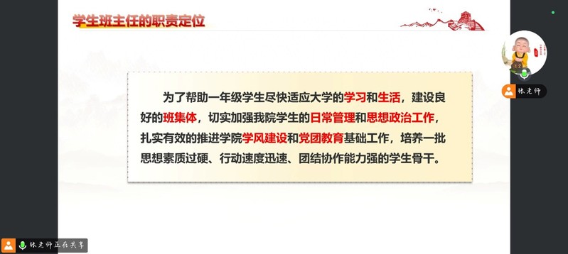 本次培训会为学生班主任明晰了工作路径,搭建了交流平台,有效促进了学院新生教育引导和班级管理工作水平的提升。