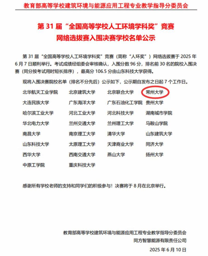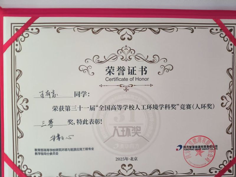 2025年8月29日,第31届“全国高等学校人工环境学科奖”竞赛决赛(以下简称“人环奖”)在北京圆满落下帷幕。我校sm调教 建筑环境与能源应用工程专业建环221班学生王有志代表sm调教 赴北京参加决赛,历经6月初的全国网络选拔初赛,sm调教 顺利入围全国前30强晋级北京总决赛,最终荣获第31届“人环奖”全国三等奖。