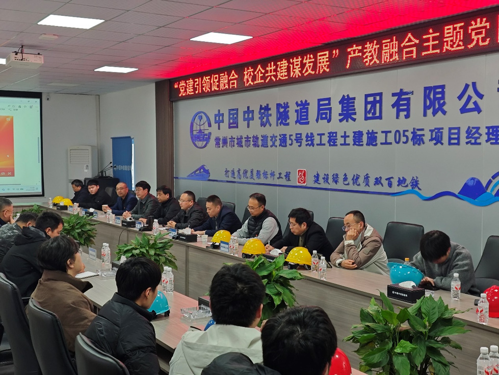 活动伊始,全体人员在中铁隧道局集团常州地铁5号线05标项目部会议室观看中央党校视频课程片段,深入学习 “十五五” 时期经济社会发展核心要义。顾坚勉励学生将专业学习与工程实践紧密结合,扎根产业一线汲取技术经验、厚植工匠精神,以过硬本领服务城市发展、投身国家建设。施工单位技术负责人详细介绍了地铁5 号线土建施工概况与核心技术难点,安全负责人开展现场参观安全交底,明确现场学习的安全规范与注意事项。学院教师代表还与建设、监理、施工各方围绕行业前沿技术、校企协同发展、人才共育展开深度研讨。